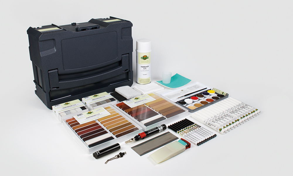 Repair-Systainer Comfort: Zum Füllen, Retuschieren und Versiegeln von Oberflächen im Innenbereich: Umfangreicher Allrounder, mit allen wichtigen Füllstoffen, Retuschiermaterialien und Hilfsmitteln. Für schnelle sowie nachhaltige und feinste Retuschier- und Instandsetzungsarbeiten an Echtholz und Dekoroberflächen. Speziell auf die Bedürfnisse im Innenausbau abgestimmt. Mit großer Auswahl an Holz- sowie RAL- Grautönen, Schwarz und Weiß. Mit den Struktur- und Retuschierstiften ist auch die lasierende Retusche möglich.